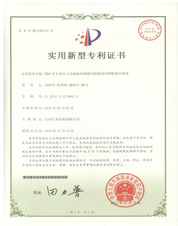 本產(chǎn)品取得專利:煤礦井下用壓人式軸流局部通風(fēng)機(jī)側(cè)進(jìn)風(fēng)降噪消音裝置專利(專利證書號第2583510號)