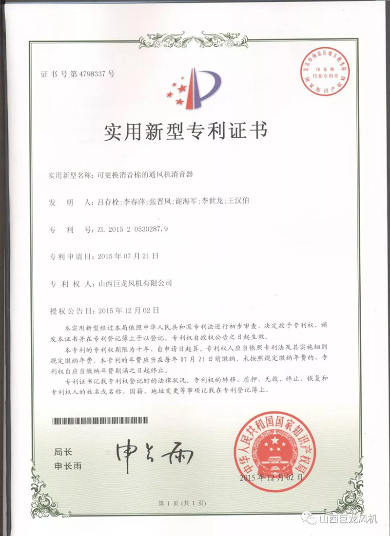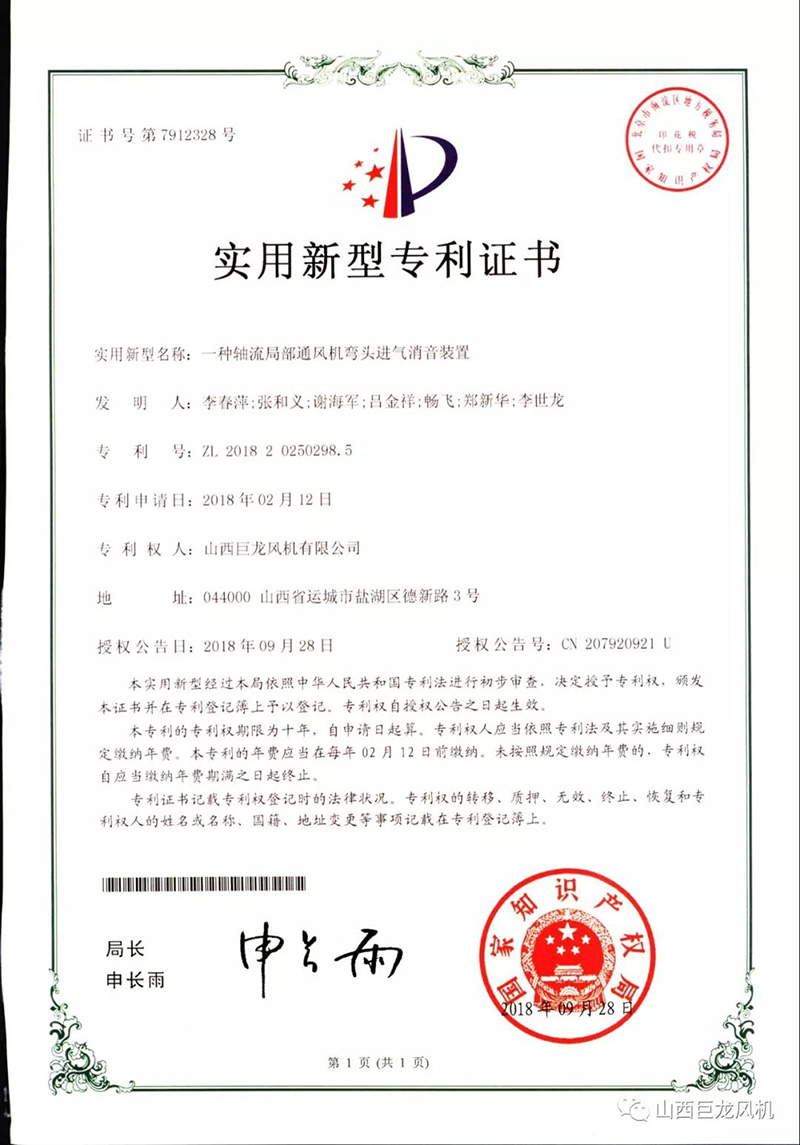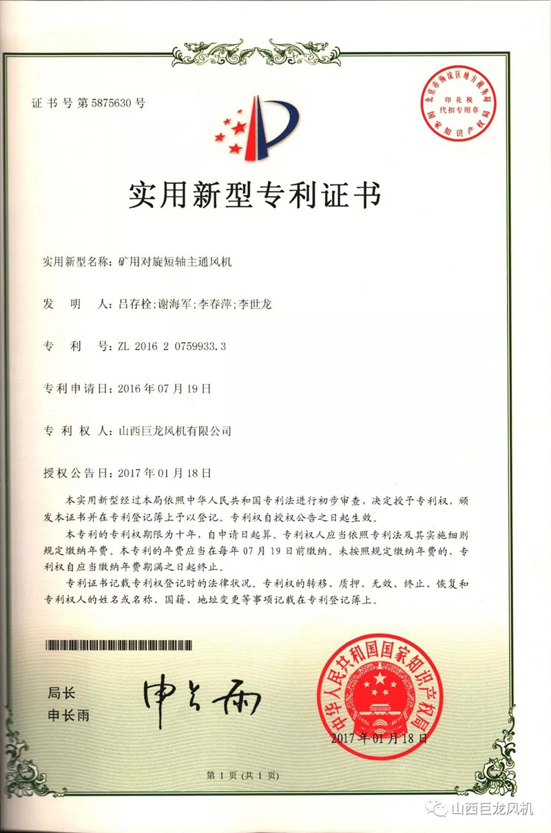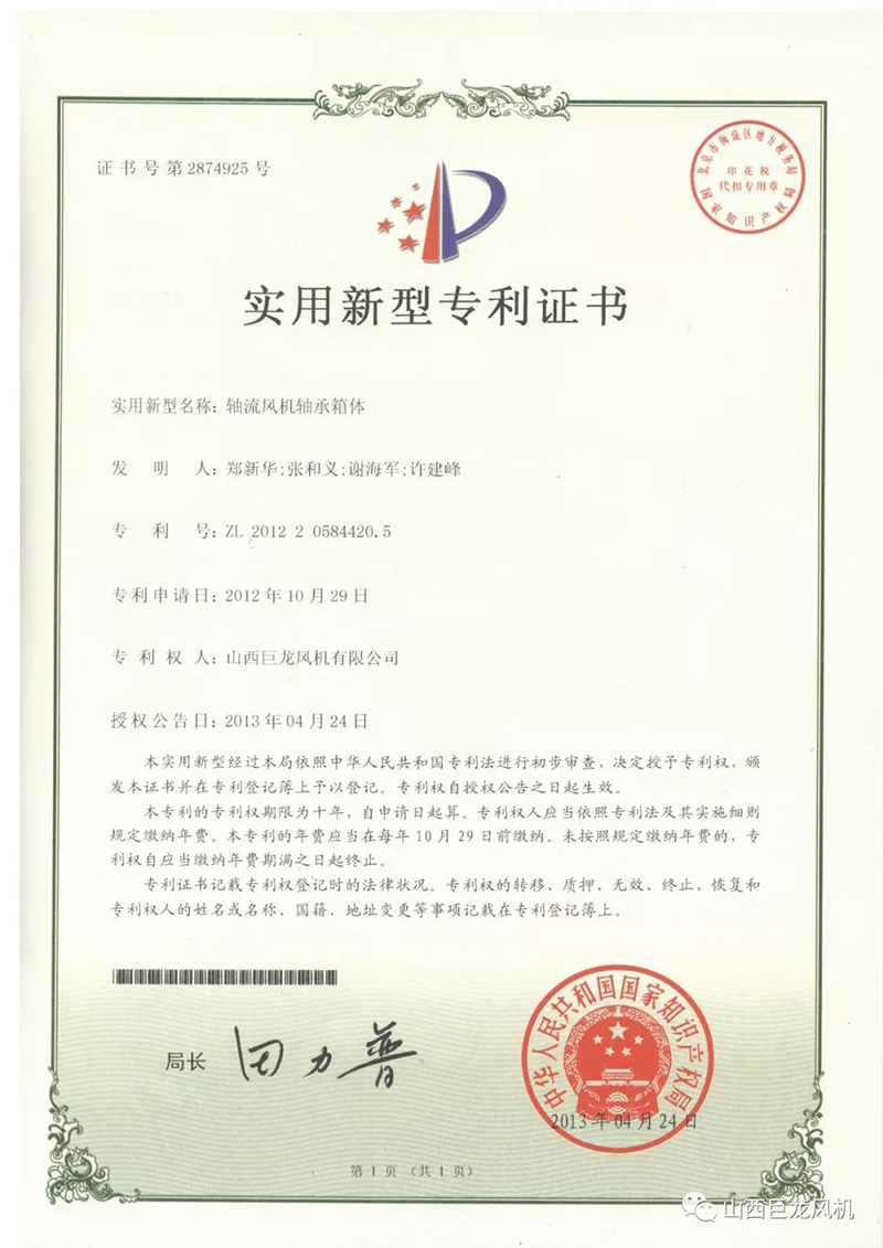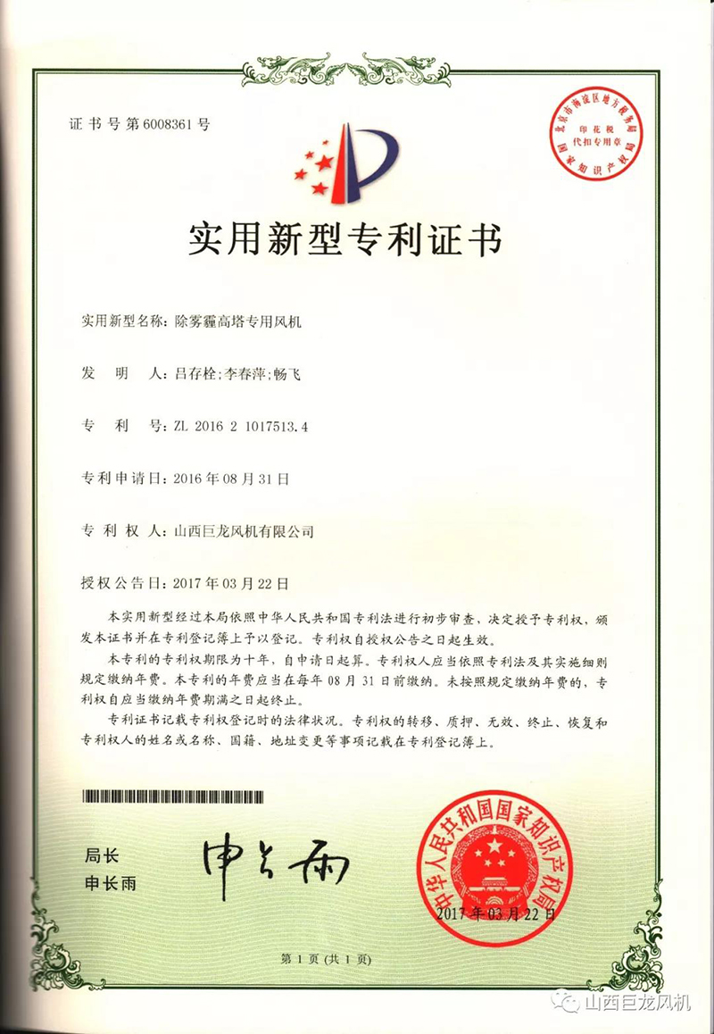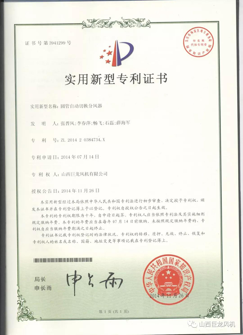 【山西巨龍風(fēng)機(jī)有限公司】——專(zhuān)利證書(shū)