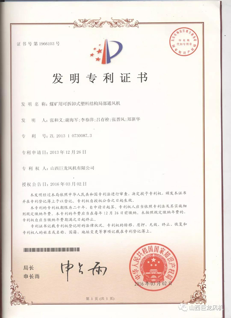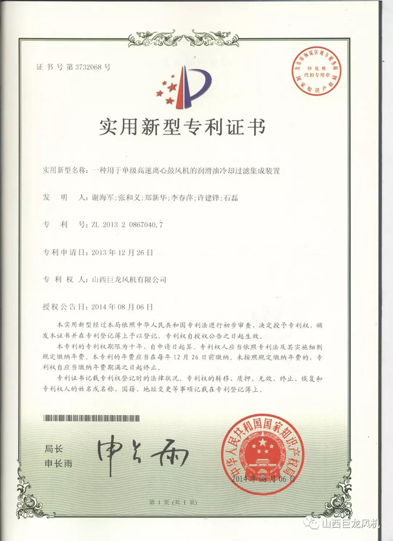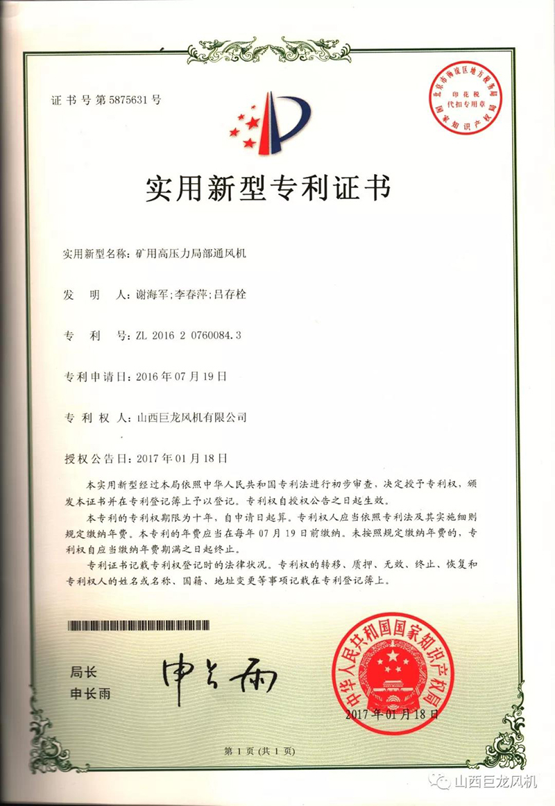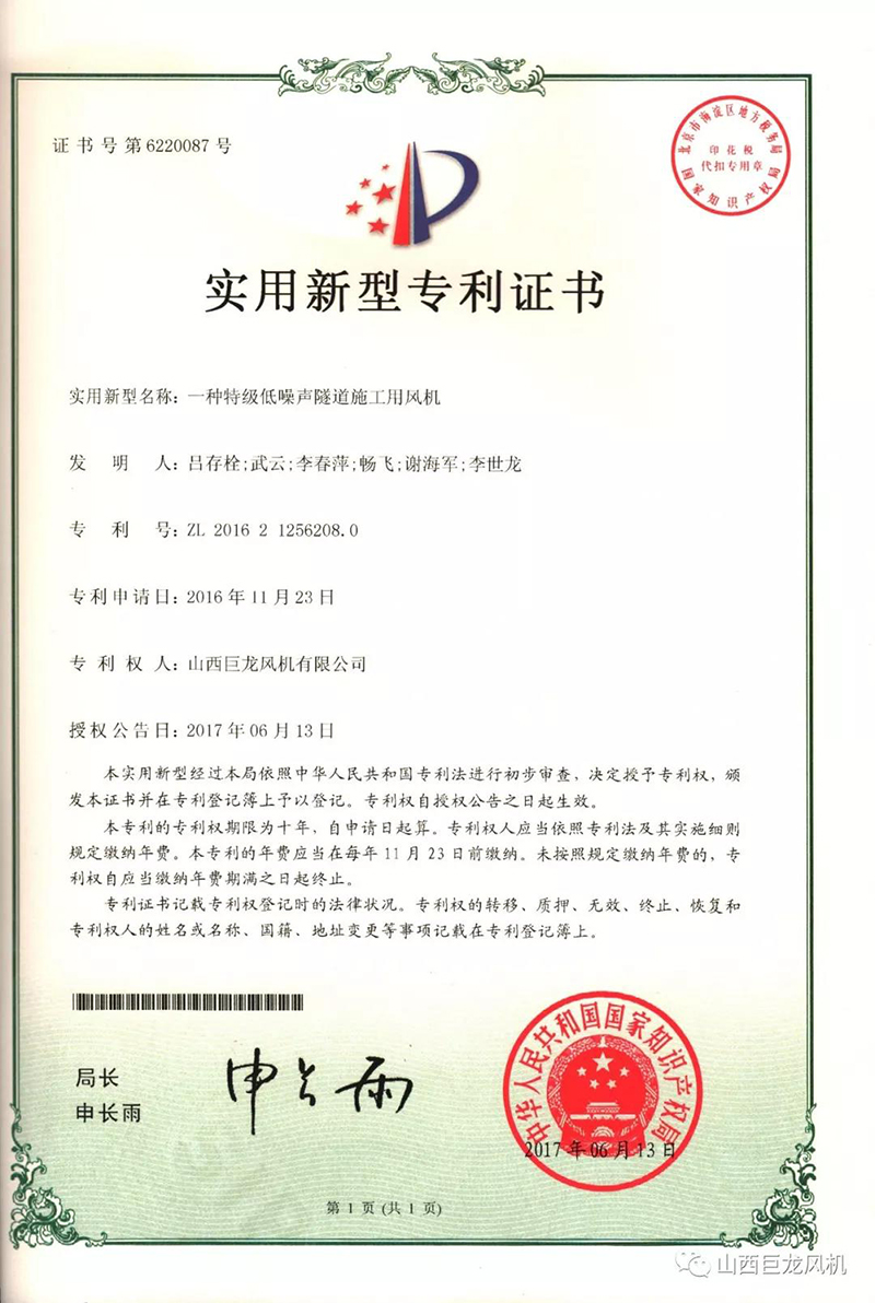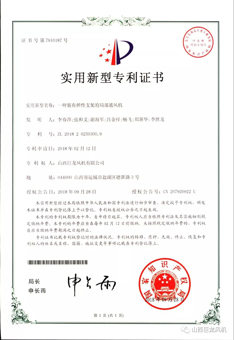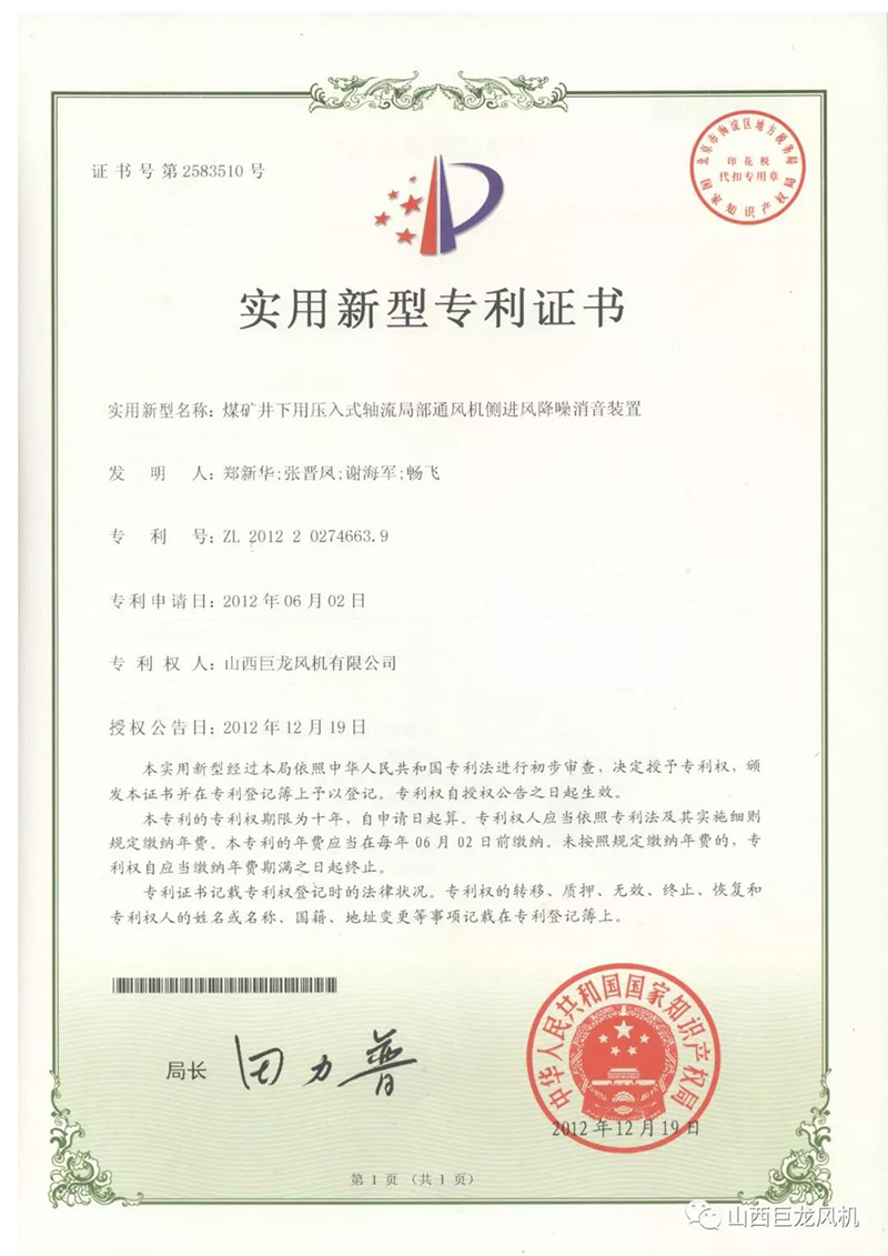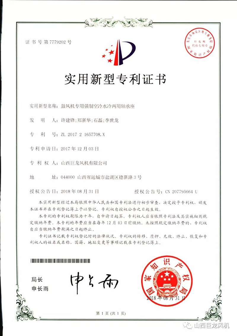 【山西巨龍風(fēng)機(jī)有限公司】——專(zhuān)利證書(shū)