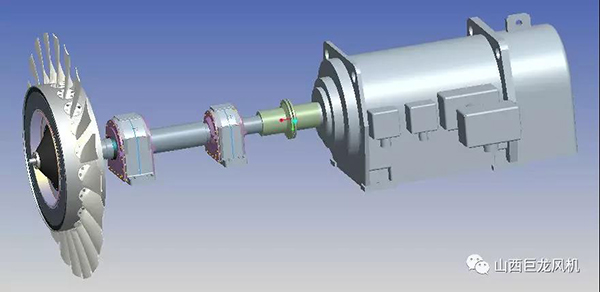 礦用短軸主扇風(fēng)機(jī)的葉輪安裝在傳動(dòng)組的主傳動(dòng)軸上,配套軸承按葉輪運(yùn)轉(zhuǎn)所產(chǎn)生的徑向和軸向載荷進(jìn)行合理配置,滿足風(fēng)機(jī)長(zhǎng)期安全運(yùn)行需求;電機(jī)主軸及軸承只承擔(dān)因扭矩驅(qū)動(dòng)和自身轉(zhuǎn)子重量產(chǎn)生的載荷,而不再額外承載其他負(fù)載(電機(jī)設(shè)計(jì)規(guī)范,明確電機(jī)軸不得承受徑向和軸向載荷),為保證電機(jī)在設(shè)計(jì)壽命范圍內(nèi)安全運(yùn)行提供了條件。